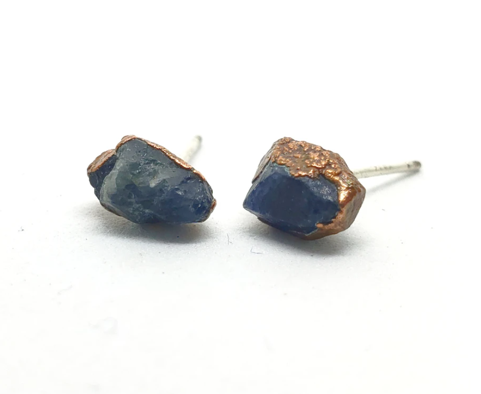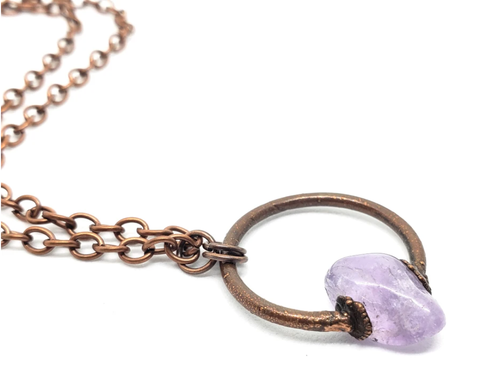 She crafts gorgeous jewelry using recycled copper and natural gemstones. The electroplating process she uses is driven by solar power, and she uses recycled materials in her packaging.